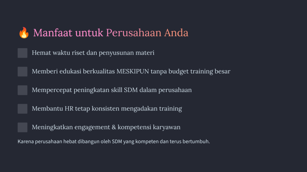 Investasi perusahaan yang sangat bermanfaat untuk tingkatkan performa tim Anda ADA 2 PILIHAN PAKET DI BAWAH INI (Kategori 7 atau PAKET LENGKAP)
